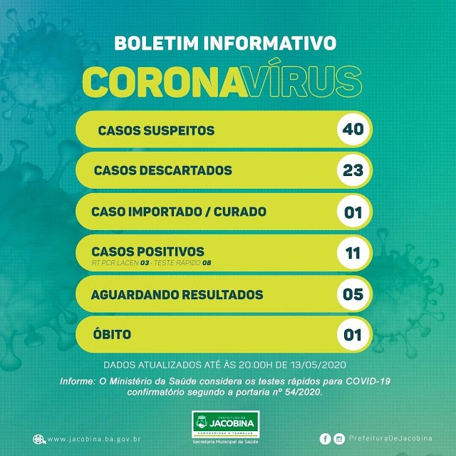 Nesta quarta-feira, dia 13 de maio de 2020, o município de Jacobina chegou a 11 casos positivos de Covid-19, sendo 5 a mais do que na última atualização.