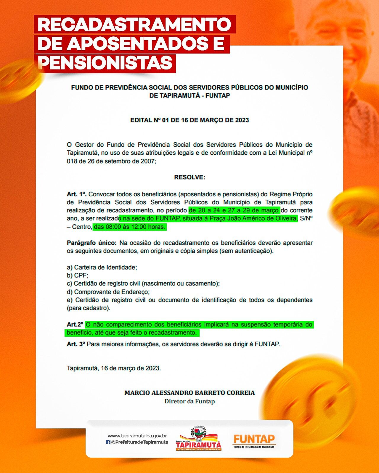 Art. 1º. Convocar todos os beneficiários (aposentados e pensionistas) do Regime Próprio de Previdência Social dos Servidores Públicos do Município de Tapiramutá para realização de recadastramento, no período de 20 a 24 e 27 a 29 de março do corrente ano, a ser realizado na sede do FUNTAP, situada à Praça João Américo de Oliveira, S/Nº – Centro, das 08:00 às 12:00 horas.